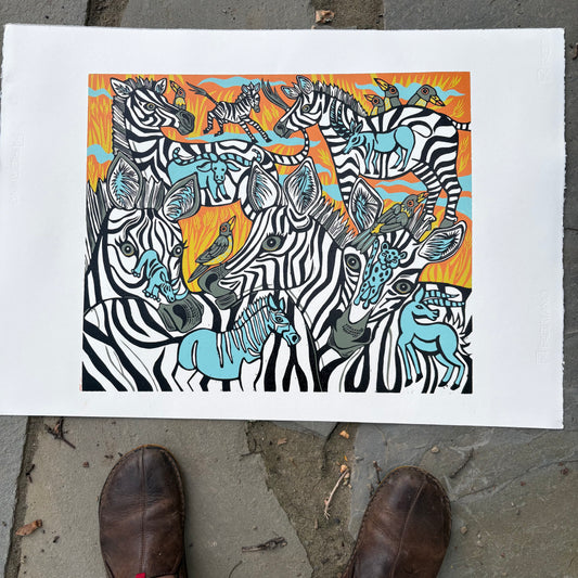Zebra and extinct megafauna original Woodcut