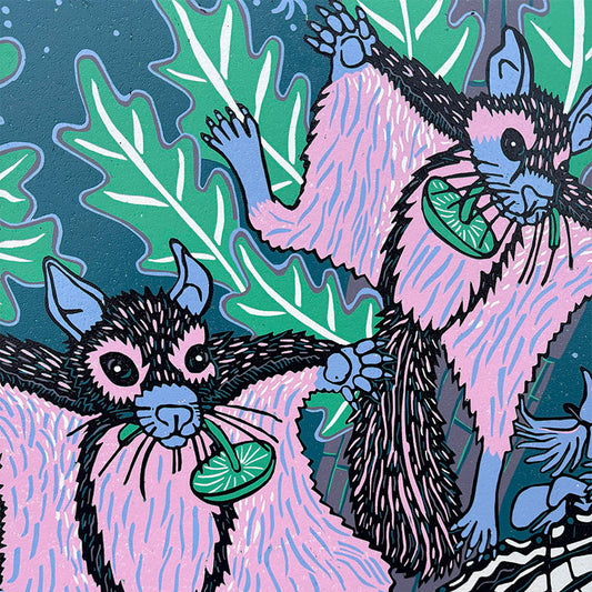 Opossum, flying squirrel orchid and swallowtail under UV light Woodcut