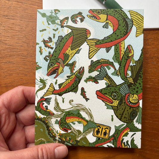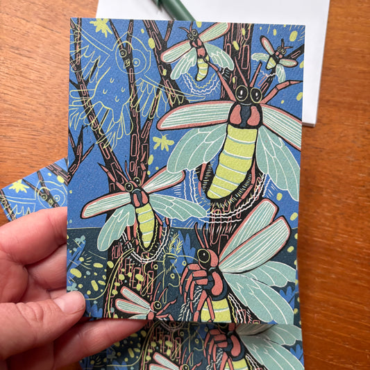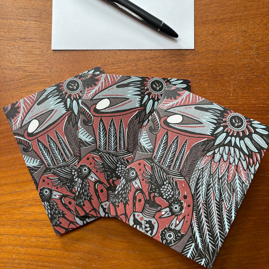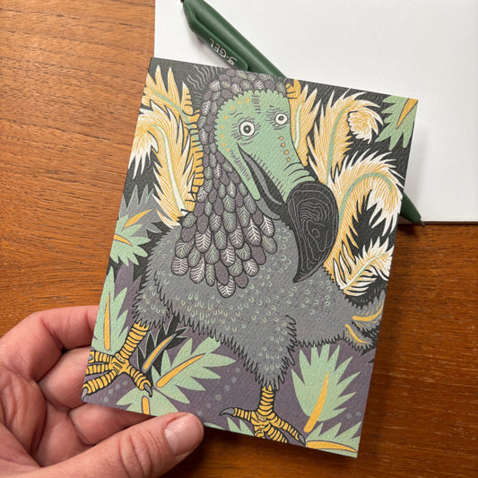 Reproductions of my sold out woodcuts printed on a fine linen 11x17" paper. Can be easily framed in a standard frame that can be found at a local shop or online. The frame is often called a "Document Frame." Cards are A2 and come in a 3 pack with envelopes.