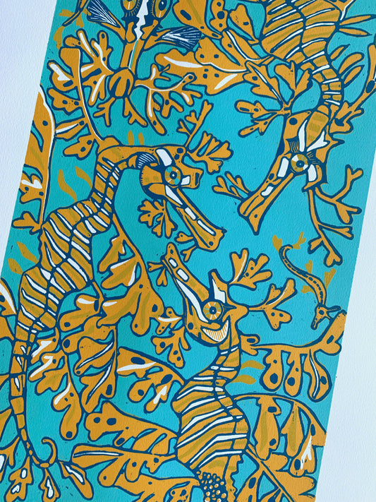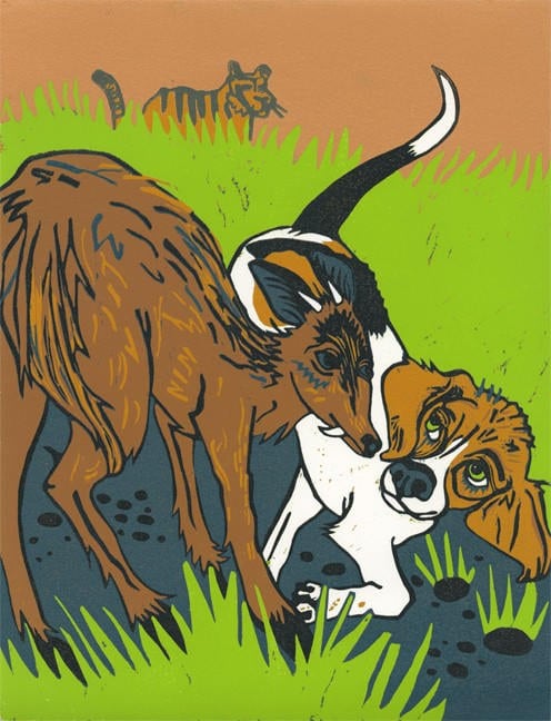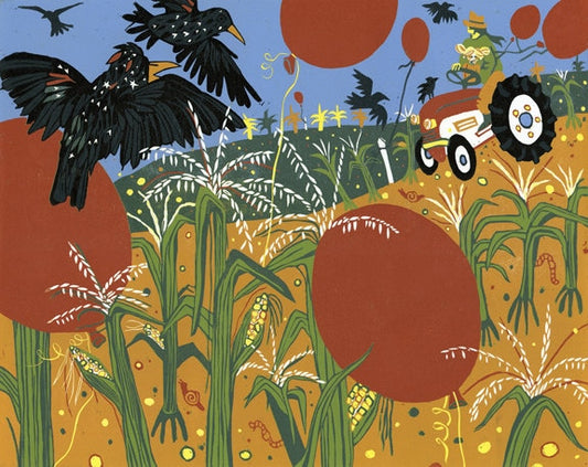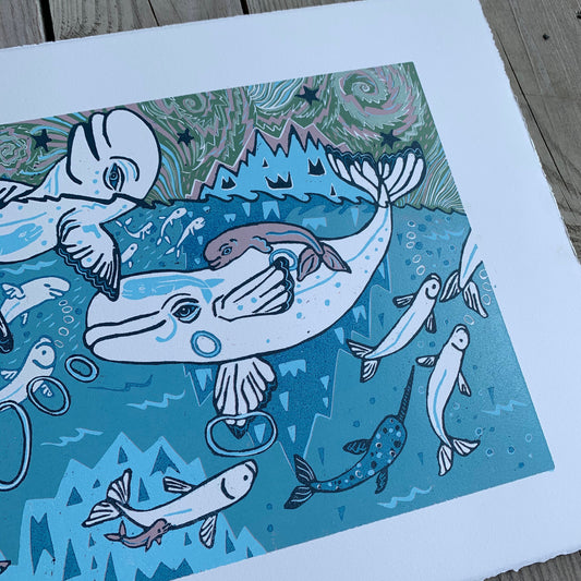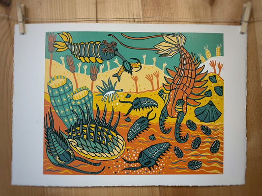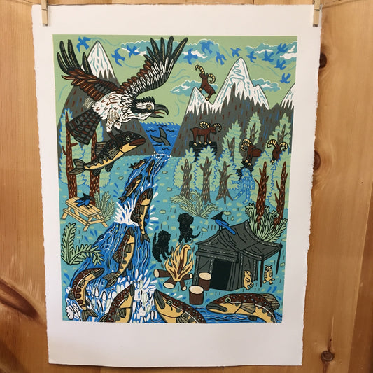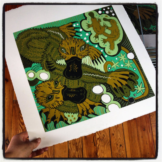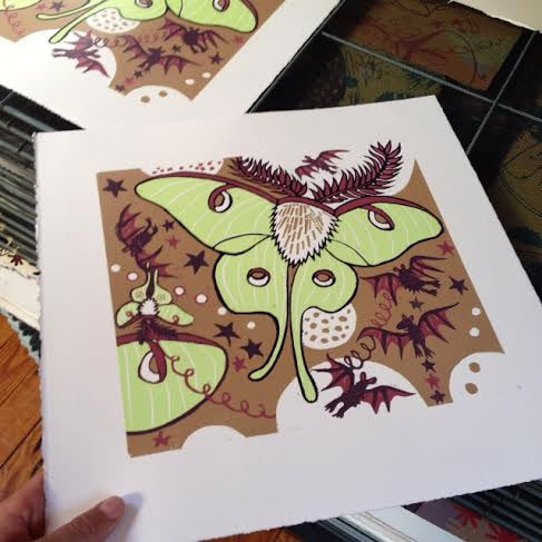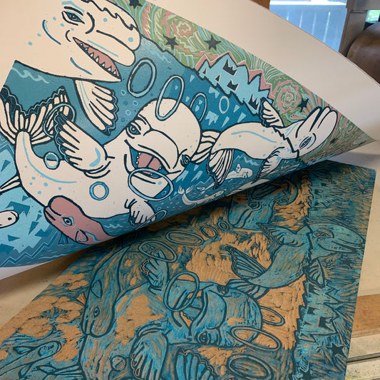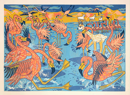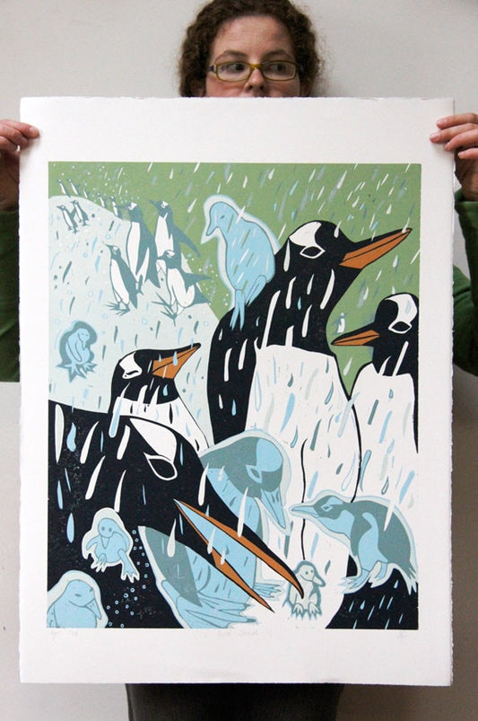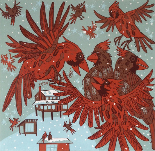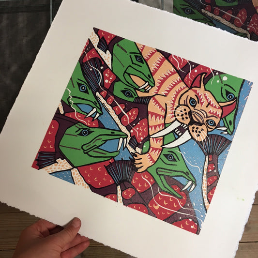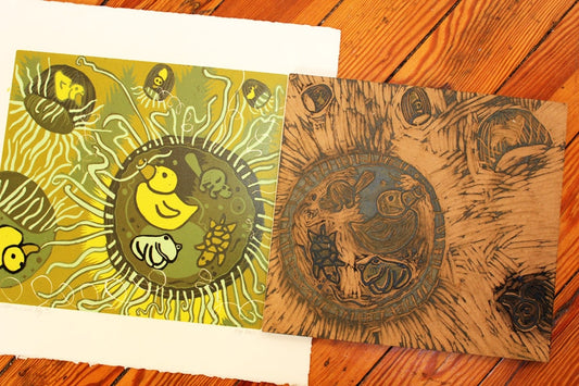 Hand carved and hand printed on a takach etching press. I mostly make reduction woodcuts which means I carve and print and carve and print each layer. I cannot ever remake an edition because I destroy the block in the process. So if you see one you love, better grab it before it's sold out.