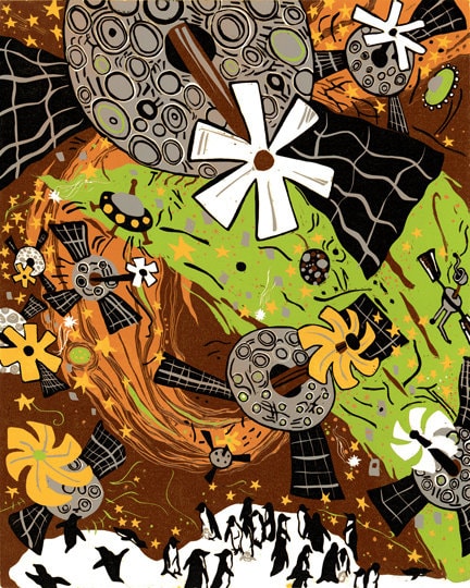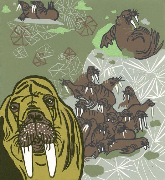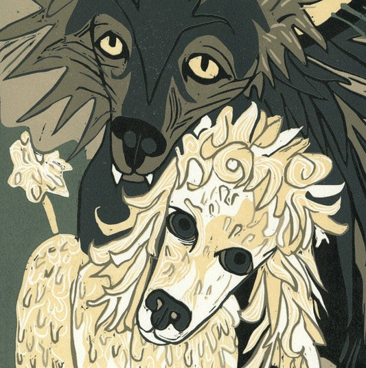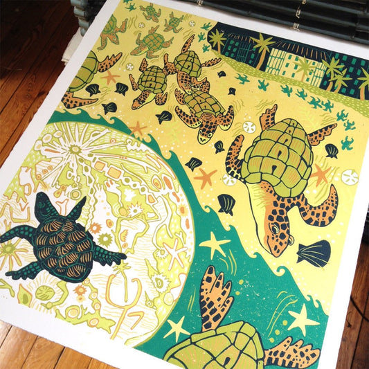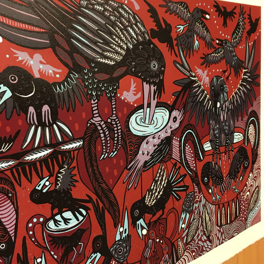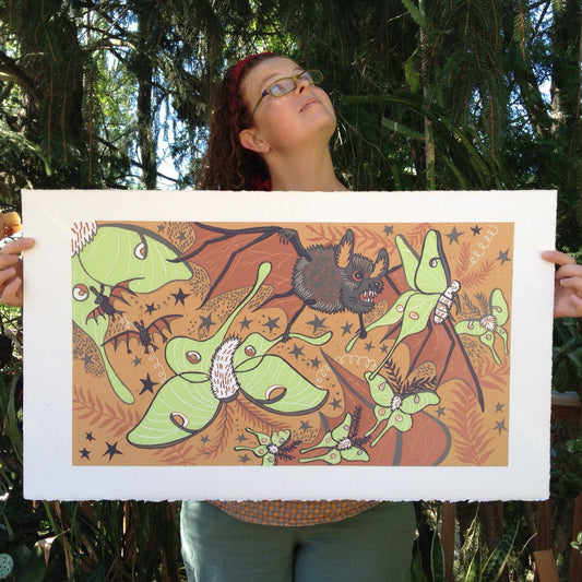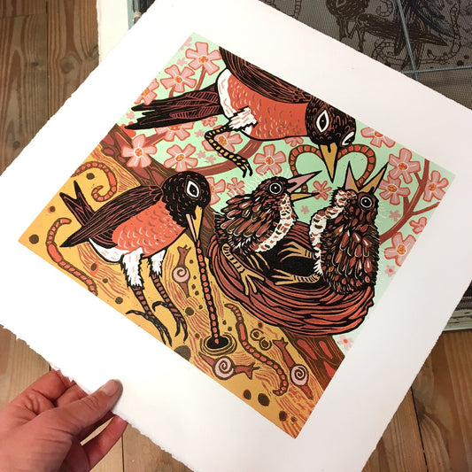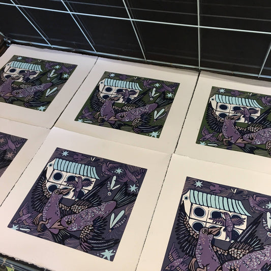 Hand carved and hand printed on a takach etching press. I mostly make reduction woodcuts which means I carve and print and carve and print each layer. I cannot ever remake an edition because I destroy the block in the process. So if you see one you love, better grab it before it's sold out.