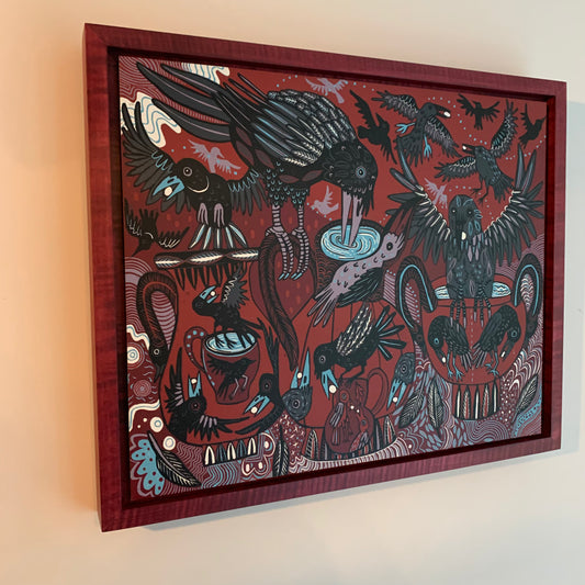 Thirsty crow woodcut framed in red
