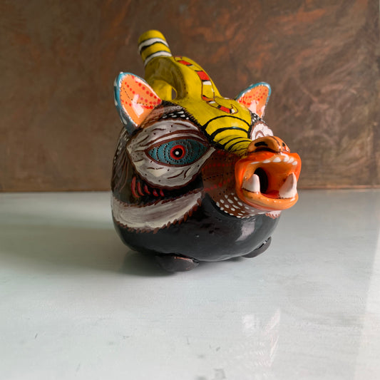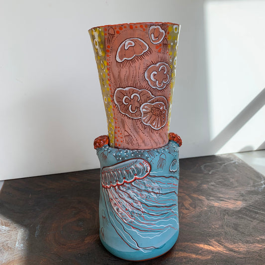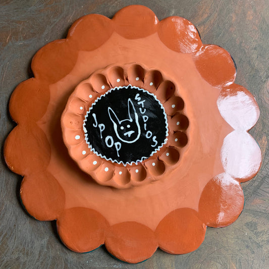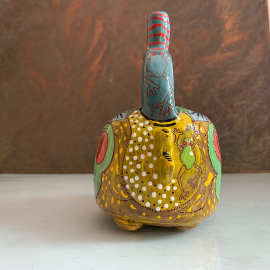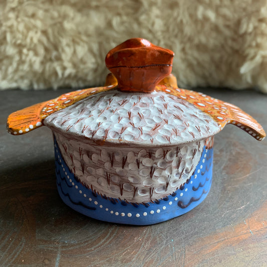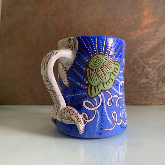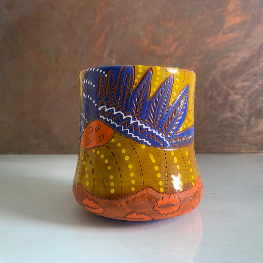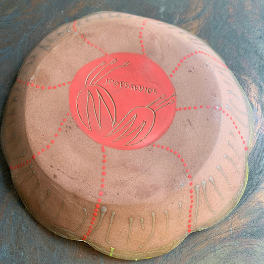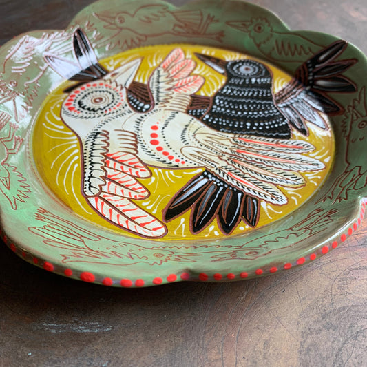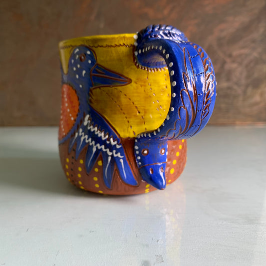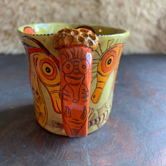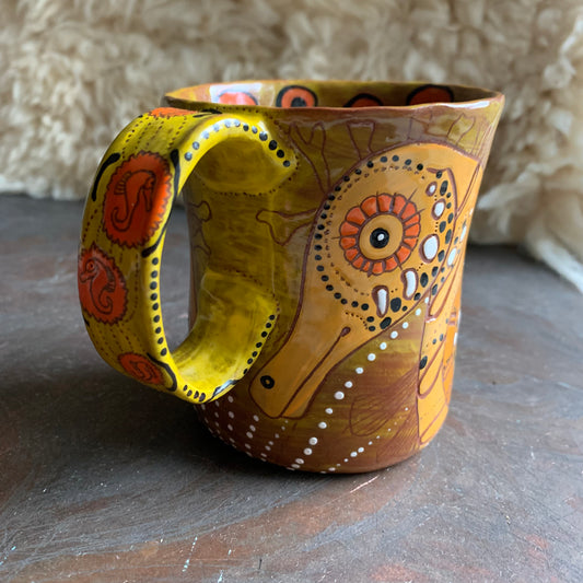 Hand painted, sgraffito carved pottery filled with animal imagery. Terra cotta clay, handbuilt, functional fine art. All of my pottery is food safe (except for the wall art or if it says it is not.) Who wouldn't want to drink or eat off a painting?