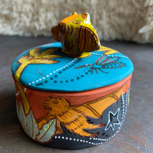 Hand painted, sgraffito carved pottery filled with animal imagery. Terra cotta clay, handbuilt, functional fine art. All of my pottery is food safe (except for the wall art or if it says it is not.) Who wouldn't want to drink or eat off a painting?