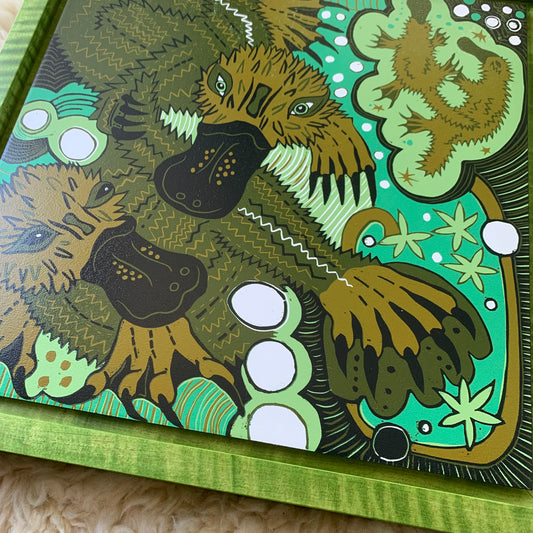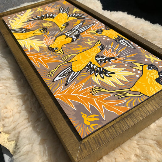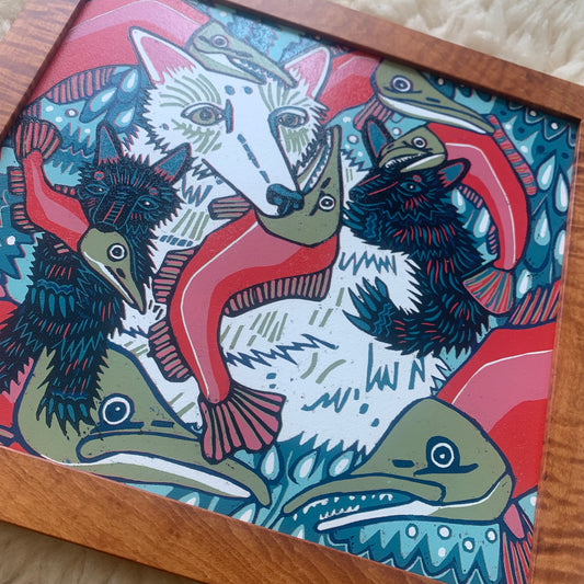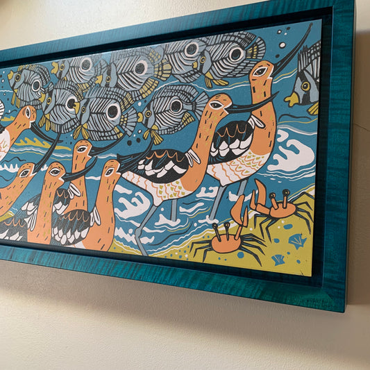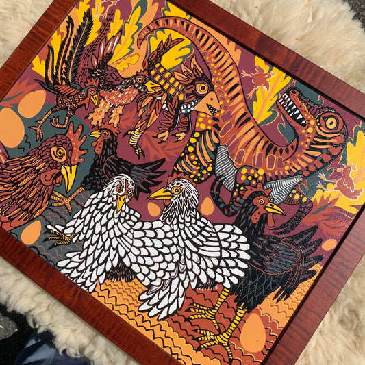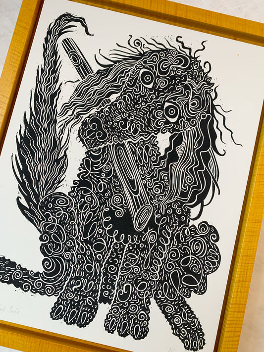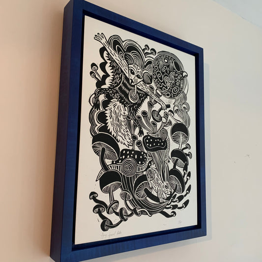 Nobody frames art like JPOPstudios. I met a wonderful woodworker in upstate NY who makes each custom frame out of curly maple. The woodcuts are varnished with a UV protective varnish, so it is like having an oil painting. All framed woodcuts are currently available just as a pre-order because I am traveling to 2 art festivals and have all my inventory.