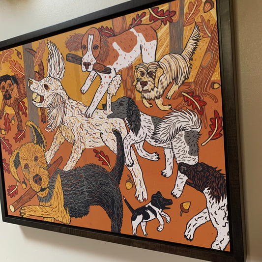 Pre-order Big dog woodcut with poodles and friends framed in black