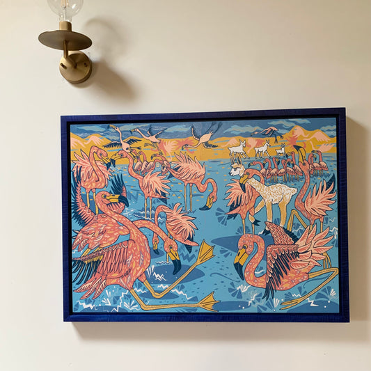 SALE IN STOCK Flamingo and llama woodcut framed in blue
