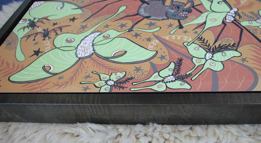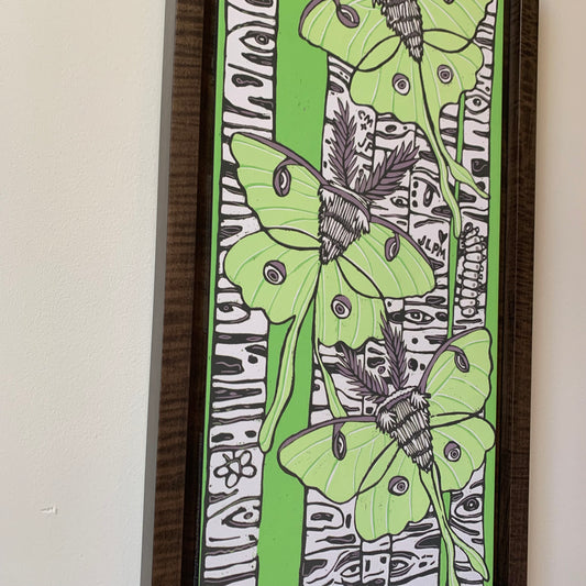 Pre-order Luna moth and birch tree woodcut framed in black curly maple