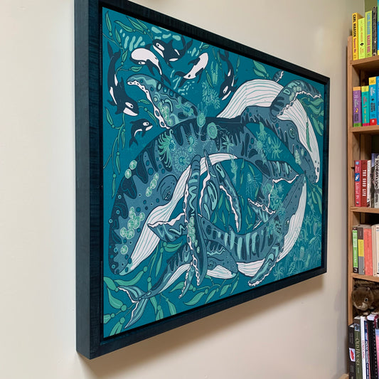 BLUE FRAME IN STOCK Humpback whale and woodcut framed in blue or natural