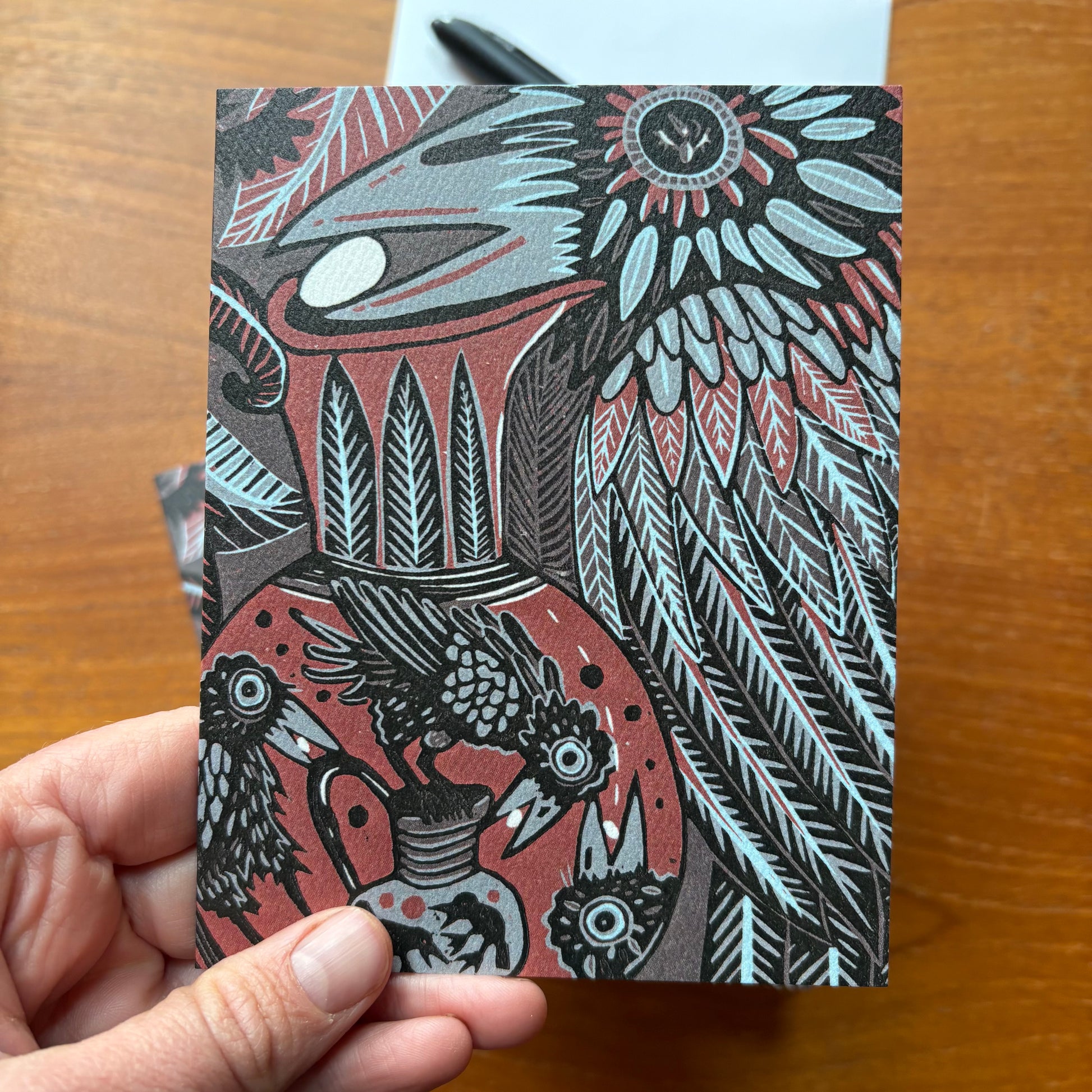 3 pack of cards and envelopes that was an original woodcut titled, "Corvids Pitcher" Blank inside, on the back it has an ecological message that says,