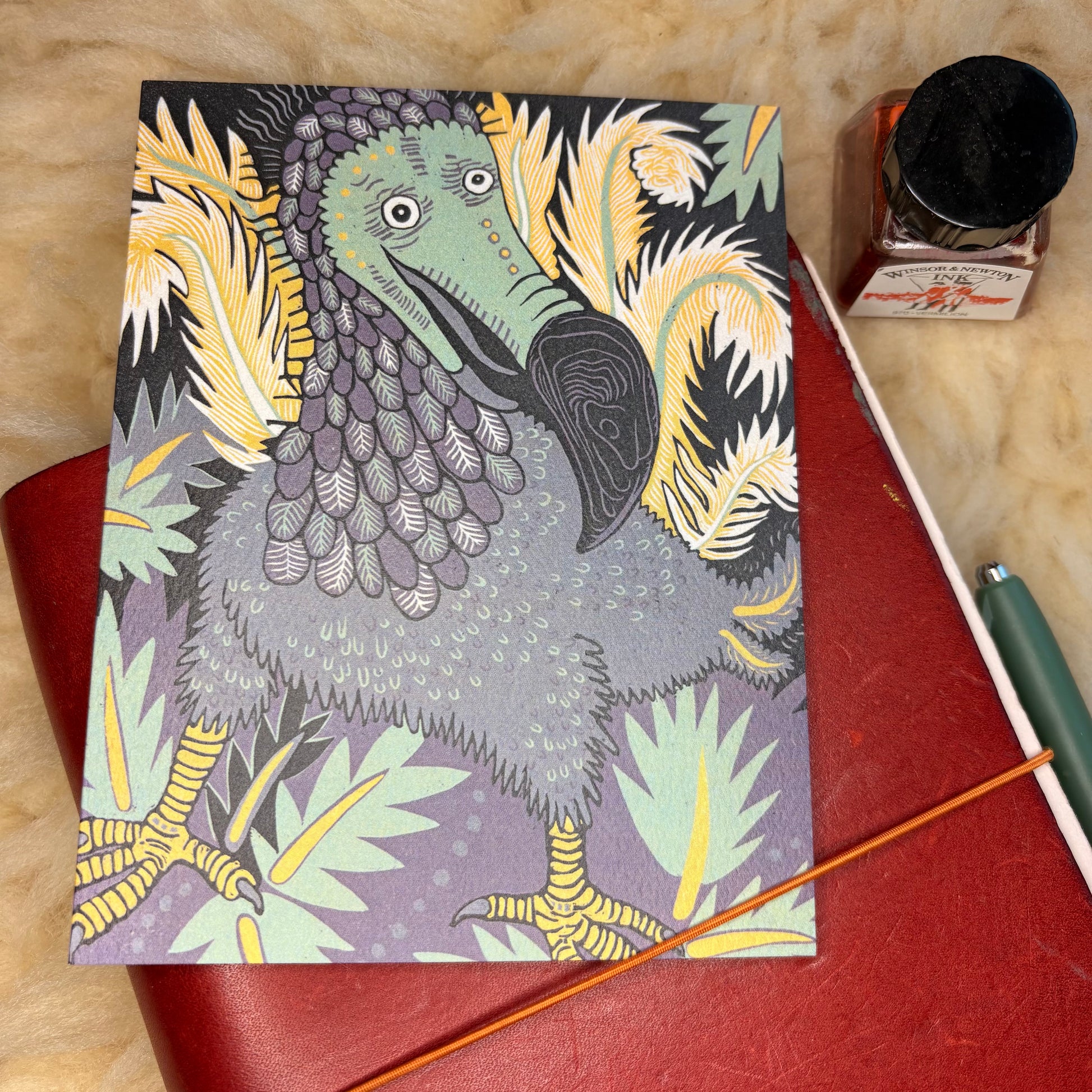 3 pack of cards and envelopes that was an original woodcut titled, "Dodo 1681." Blank inside, on the back it has an ecological message that says,