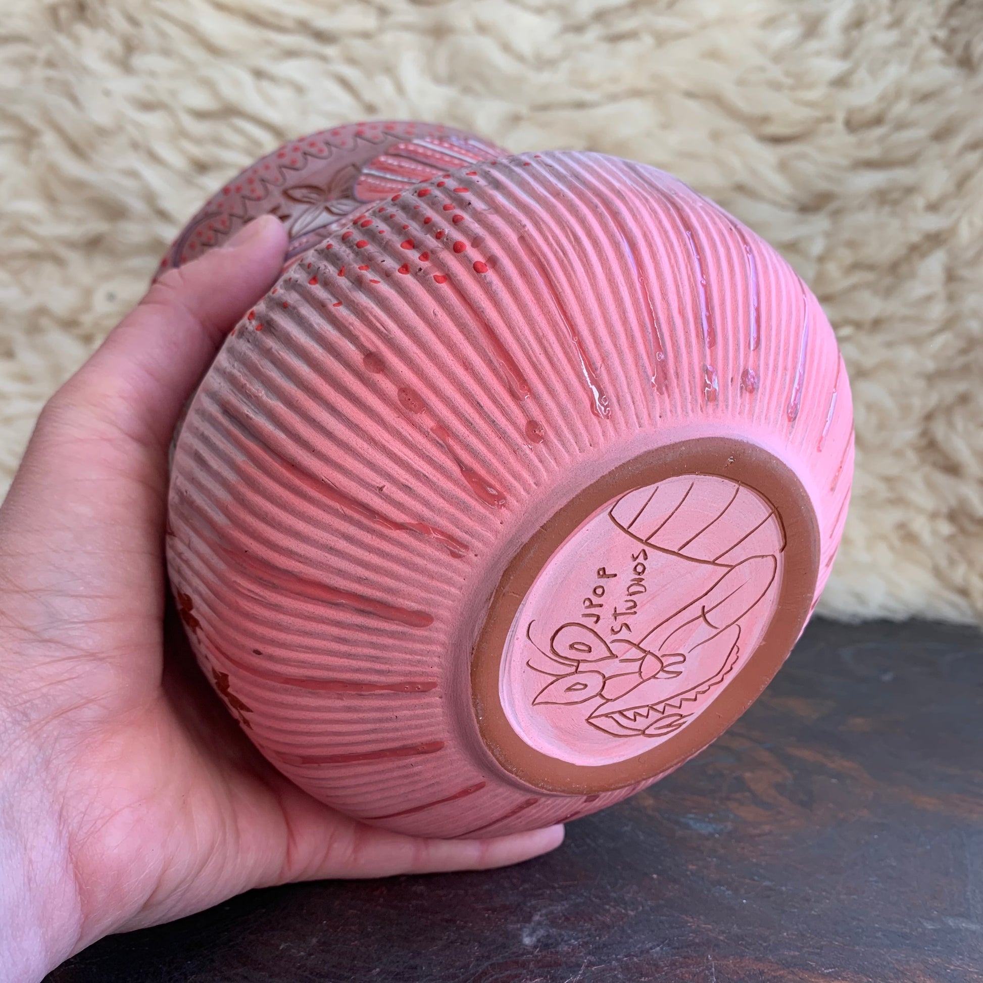 She's a pretty gal these orchid mantises. I don't always make pink pieces but here one is! It can be used as a vase, either real flowers, dried flowers, or felt flowers, it's probably even wide enough to be used as a utensil holder if you don't have 20 utensils like I do on my counter. It is about 6" tall.