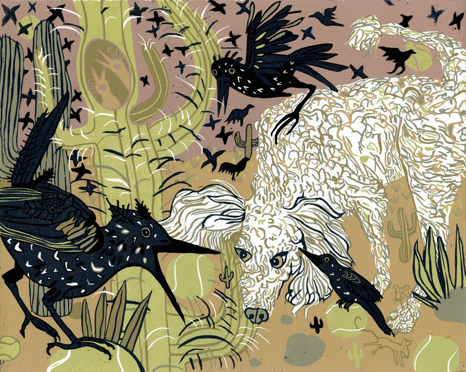 This original hand-pulled color-reduction woodcut features lots of black birdies. The title is, "Ellie in the Middle"